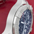Very dark blue Dial with luminous Arabic numerals. Red 24 hour GMT hand