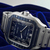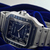 Stainless Steel square style case with blue PVD bezel and faceted blue synthetic sapphire setting crown (40x48mm). Water resistant at 100 meters / 1000 feet