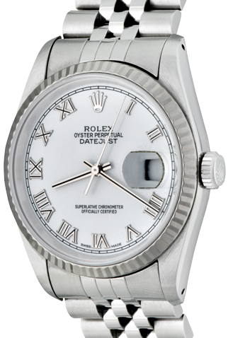 Stainless Steel case with 18k White Gold fluted bezel (36mm dia.)