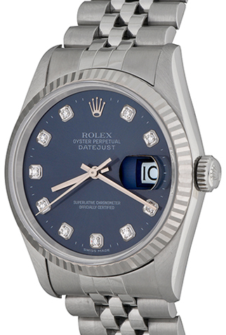 Stainless Steel case with 18k White Gold fluted bezel (36mm dia.)