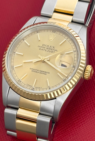 Stainless Steel case with 18k Yellow Gold fluted bezel (36mm dia.)